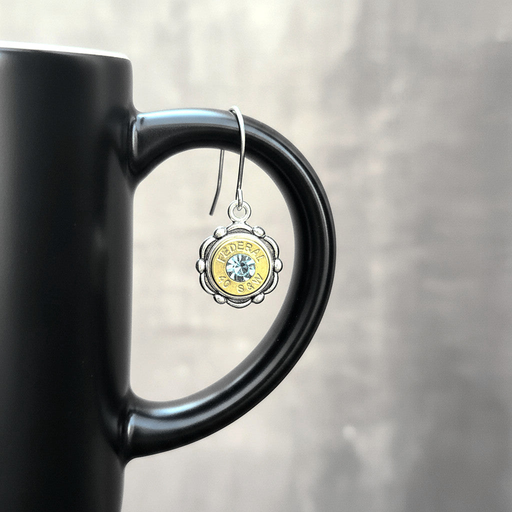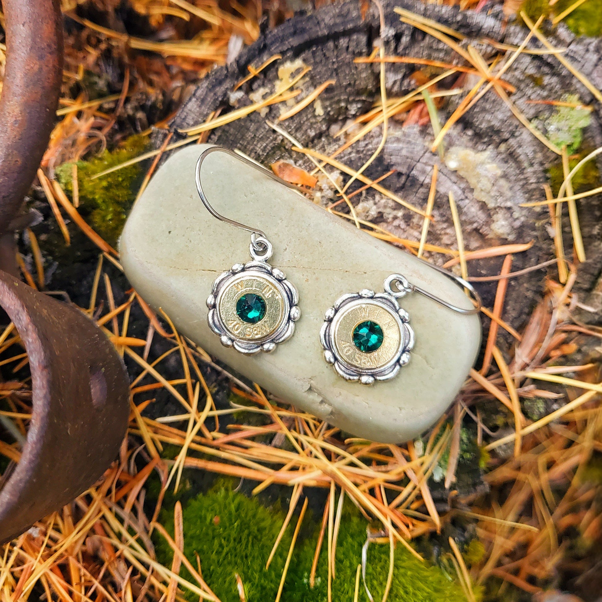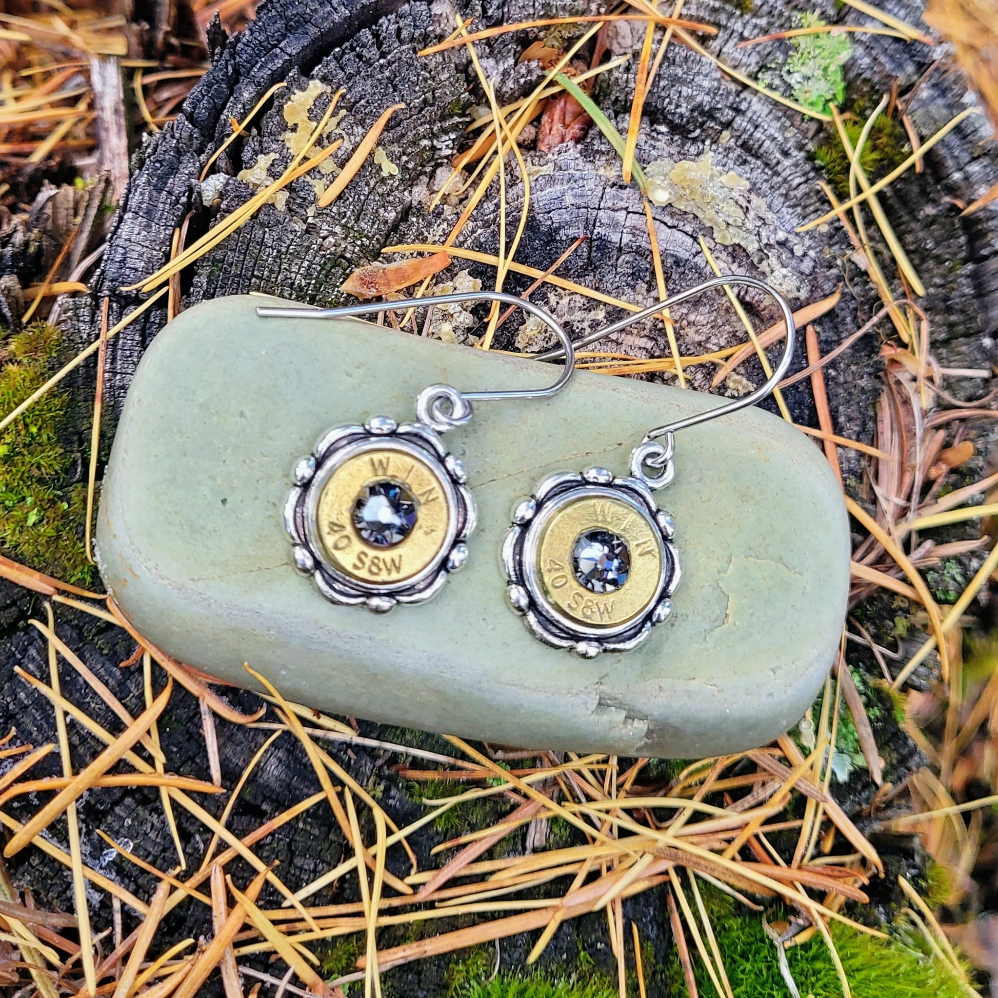 Vintage, flowery charm. Antique silver-plated .5" diameter settings hold pistol caliber headstamps with Swarovski crystals on top. Earwires are .75" stainless steel.